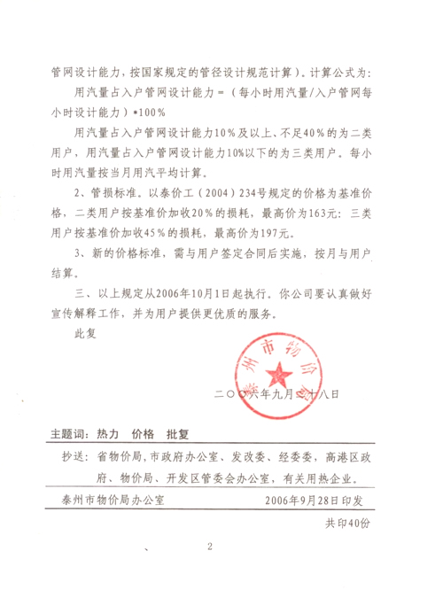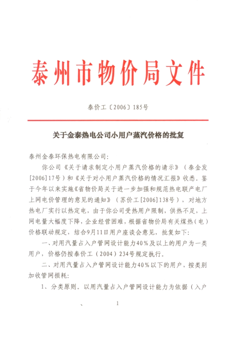 关于调整金泰热电公司小用户蒸汽价格的批复