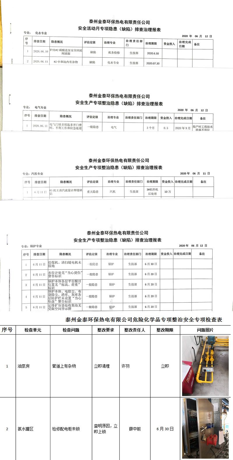 根据公司《危险源辨识和风险管控管理制度》和《隐患排查与治理管理制度》,各小组进行风险动态管理和持续运行,对全公司隐患进行编号,实行销号管理;对所属范围内日常管理、现场管理、台账资料进行全面排查,持续完善风险辨识分级管控和隐患排查治理体系;各小组围绕“设备整治年”对主设备及系统、主要辅机进行检查评估,并分专业对全厂区域内的设备设施、安全标识等进行全面排查并形成隐患清单,按照隐患清单逐项落实整改责任人与整改时间,确保闭环处理。
